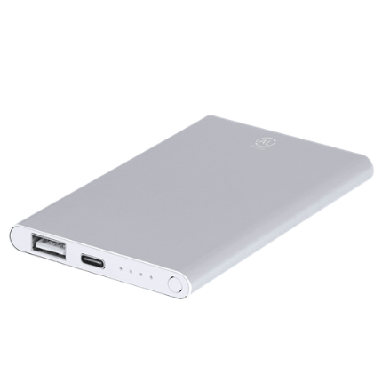 Batería estilo "Power Bank" elaborado con aluminio reciclado, con salida USB y entrada tipo C.