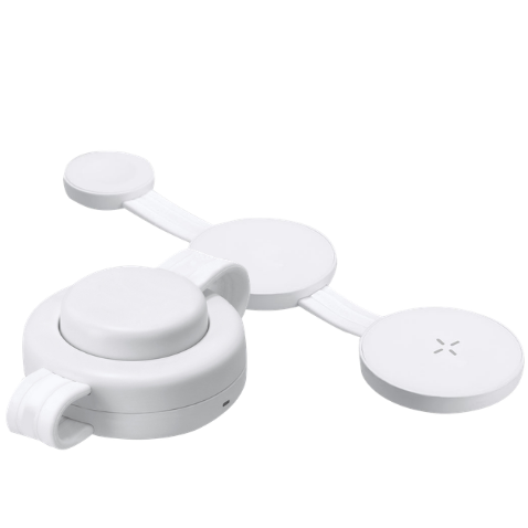 Cargador inalámbrico extensible con tres puertos de carga, con potencia base de 15W.
