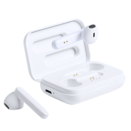 Auriculares inalámbricos con conexión Bluetooth, batería de 30 mAh y base de carga de 300 mAh.