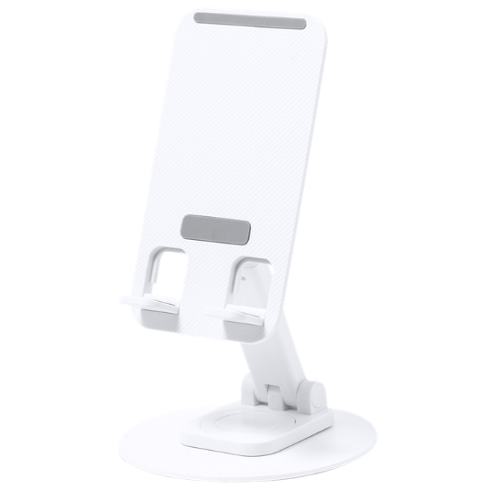 Soporte plegable para móviles hecho de aluminio y termoplásticos, con la capacidad de regular altura y ángulo.