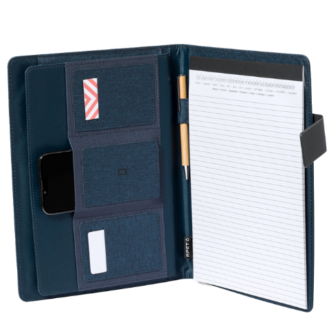 Carpeta elaborada en poliéster con una resistencia de hilo de 600D, con un bloc de notas de 20 hojas incluido.