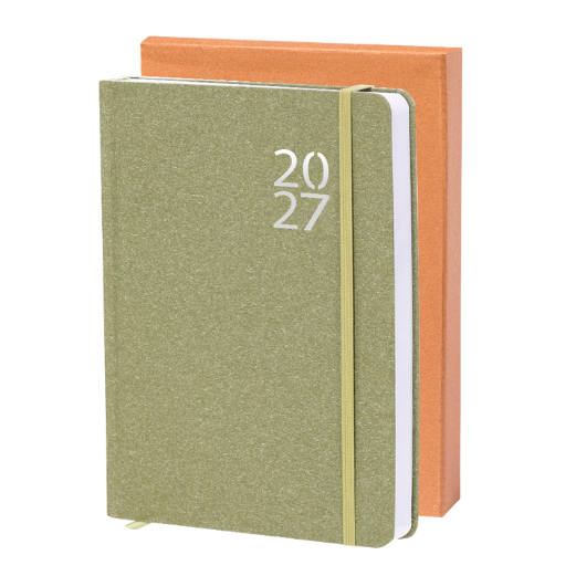 Agenda hecha con cartón reciclado, paginado a día impreso y con caja de presentación incluida.