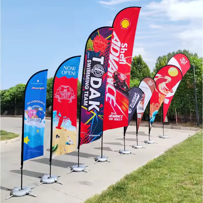 Fly Banner con varias formas hecha 100% en poliéster, con un mástil resistente e impresión a todo color.