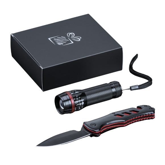 Set especial con una herramienta de rescate de titanio con rompecristales y una linterna de luz LED.