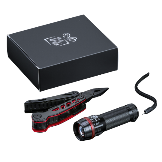 Set especial con multiherramienta de titanio junto a alicates de acero y una linterna de luz LED.