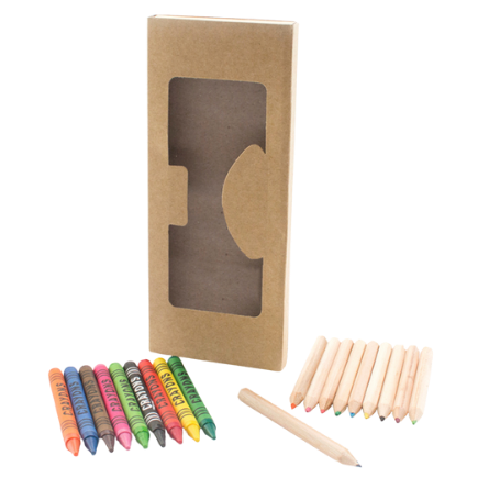Conjunto de ceras y lápices de colores de 19 piezas envueltos en una base de cartón reciclado,