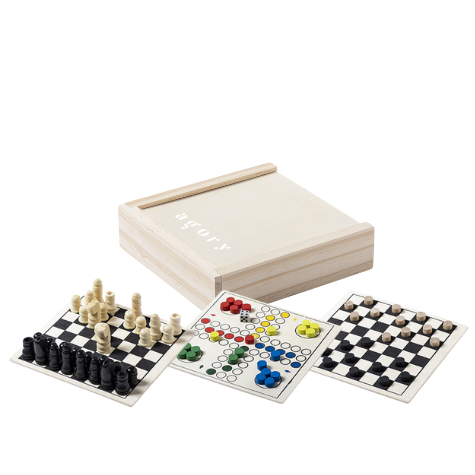 Set con tres juegos de mesa (ajedrez, damas y parchís) hecho en madera, con piezas de cada juego incluidas.