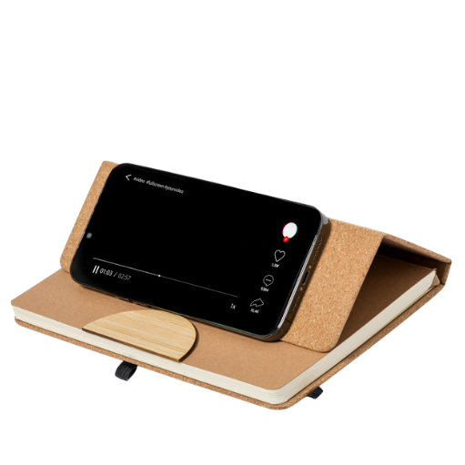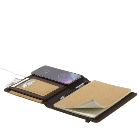 Bloc de Notas de 64 hojas elaborado en corcho y enfundado, con cargador inalámbrico incluido.