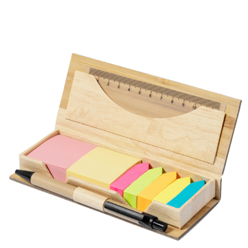 Set de oficina hecho en bambú, con 220 notas adhesivas, regla de 12 cm y bolígrado de cartón reciclado incluido.
