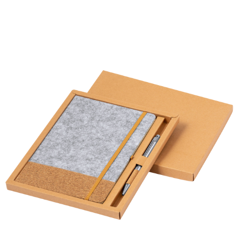 Set con un bloc de notas de corcho y portada rígida junto a un bolígrafo de aluminio y corcho reciclado.