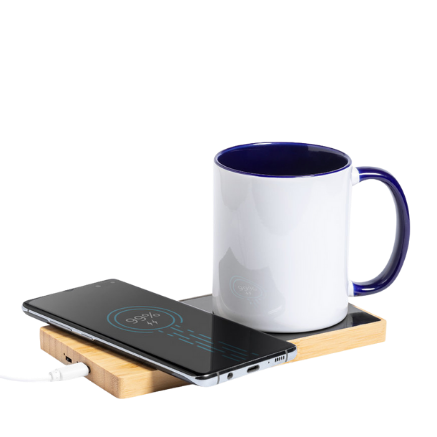 Calentador elaborado en bambú para tazas de cerámica, con conexión USB y cargador inalámbrico incluidos.