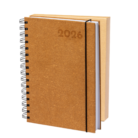 Agenda elaborada con cuero reciclado y paginado al día, presentado en una caja de cartón reciclado.