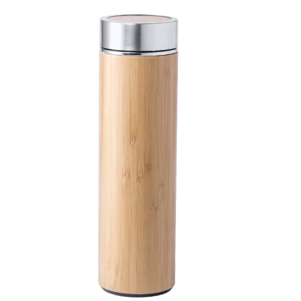 Termo hecho en bambú y revestido con acero inoxidable en su interior, de hasta 500 ml de volumen.