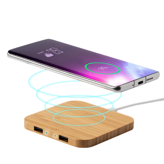 Cargador con carcasa elaborada en bambú, cargador inalámbrico y dos puertos tipo USB.