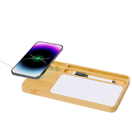 Organizador elaborado en bambú con cargador inalámbrico y pizarra blanca; incluye rotulador y goma.
