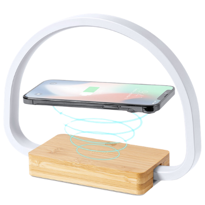 Lámpara de bambú y aluminio con cargador inalámbrico junto a conexión tipo USB.