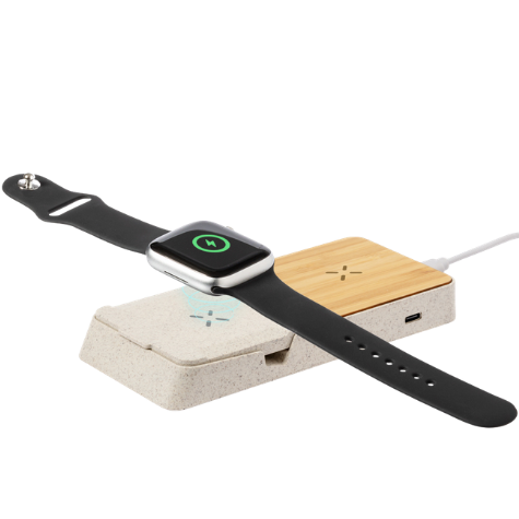 Cargador inalámbrico elaborado en caña de trigo y bambú, con cable de tipo C incluido.