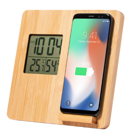 Estación meteorológica elaborado en bambú, con reloj, cargador inalámbrico y batería de forma redonda.