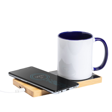 Calentador para tazas elaborado en bambú, con cargador inalámbrico y conexión USB incluidos.