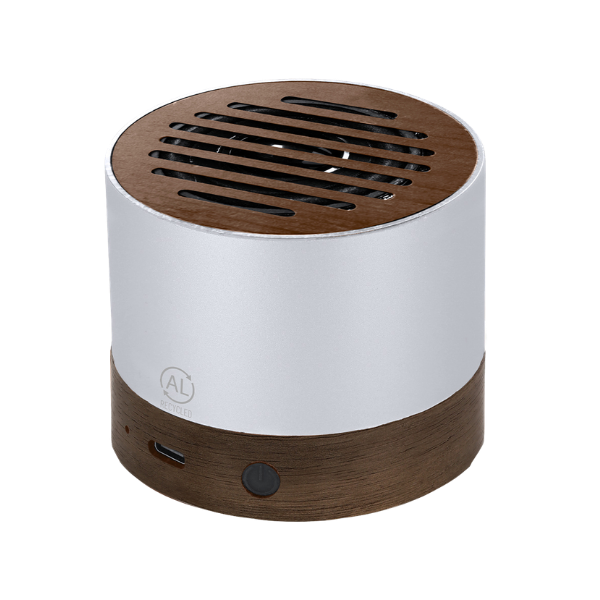 Altavoz hecho de madera y aluminio reciclado, con conexión Bluetooth y potencia de 3W.